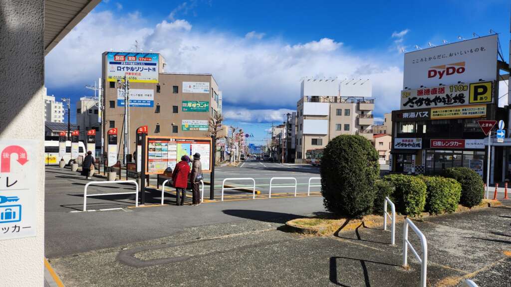 駅前のロータリーからの写真です、駅から海が見えるのわかりますかね。ぴったり海まで徒歩3分です!